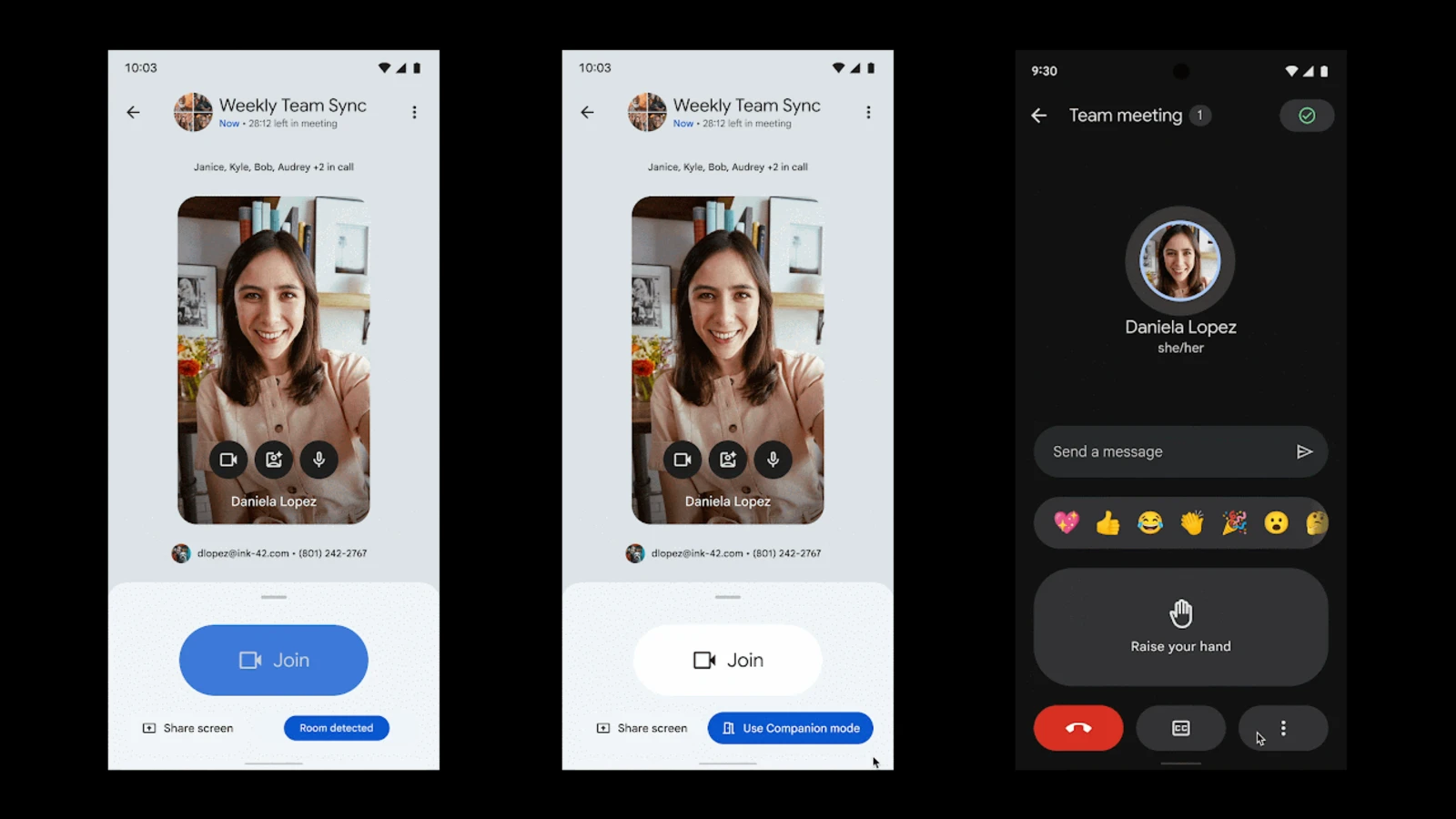 今回のアップデートにより、Google Meet アプリはユーザーが会議室にいることを超音波近接検出によって認識し、参加前の待機画面で「コンパニオンモードの使用」ボタンを強調表示するようになります。