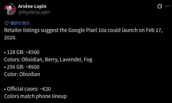 これはリーカーの @MysteryLupin が X で共有したもので、Pixel 10a の価格設定は前モデルから据え置きとなる可能性が高く、発売日は 2 月 17 日になることを示唆しました。