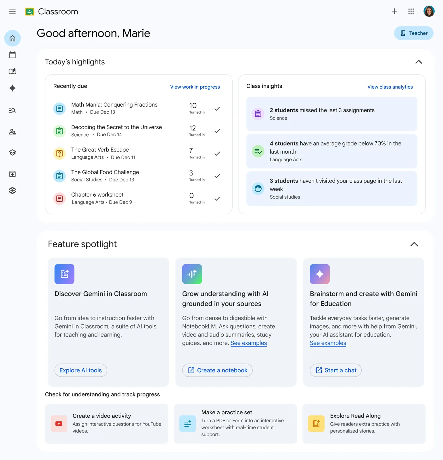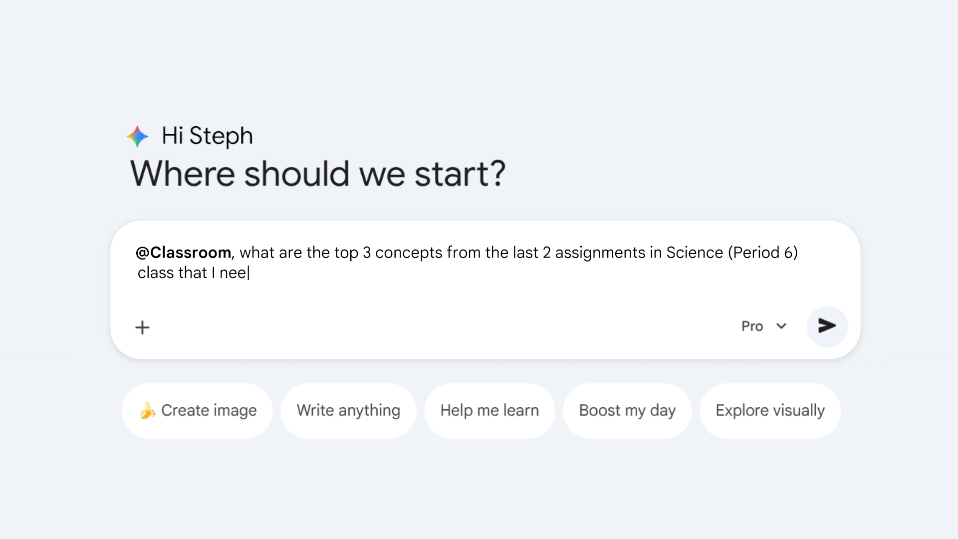 また、今後数週間のうちに Gemini は Google Classroom 内の情報を文脈として理解し、課題の下書き作成や生徒の進捗状況の要約といったタスクをサポートできるようになります。