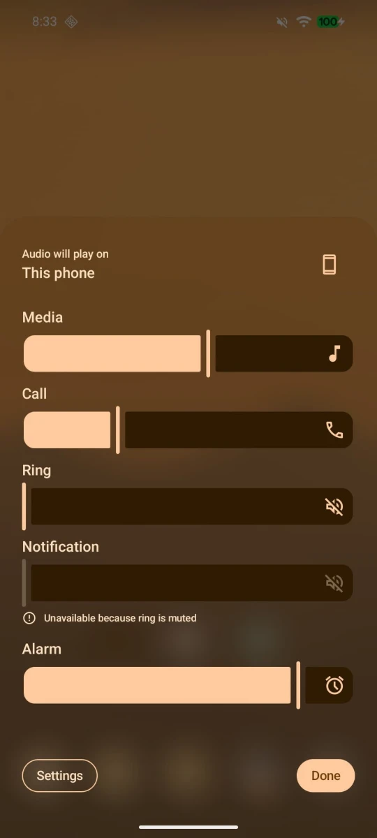 • 音量パネル: 背景が半透明になり、壁紙や背面のアプリが透けて見えるようになります。また、3点リーダーのアイコンデザインも変更され、パネル下部にはアプリアイコンが表示されるレイアウトになっています。