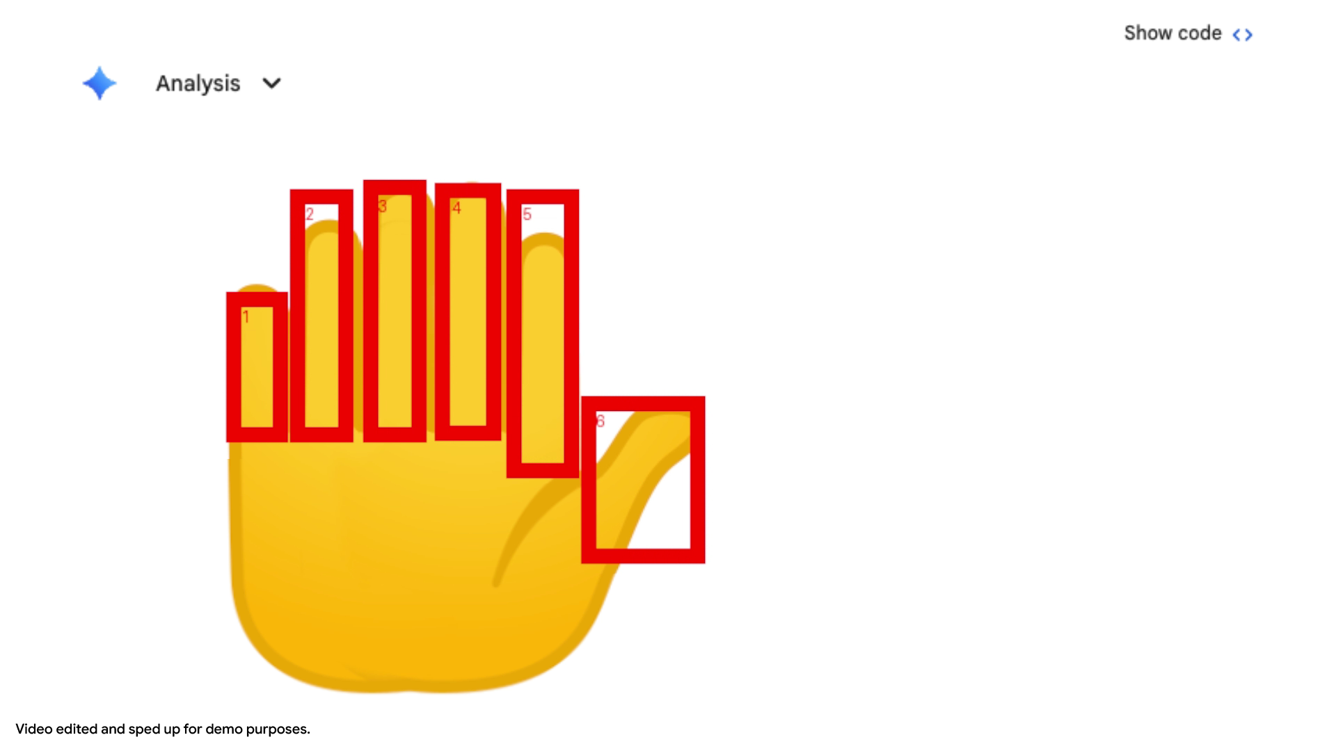 AI にとって「画像内の物体を数える」のは意外と難しいタスクです。 Agentic Vision では、例えば「手の指を数えて」と頼むと、Python コードを使って検出した指一本一本に「バウンディングボックス(枠)」と「番号」を描き込みます。