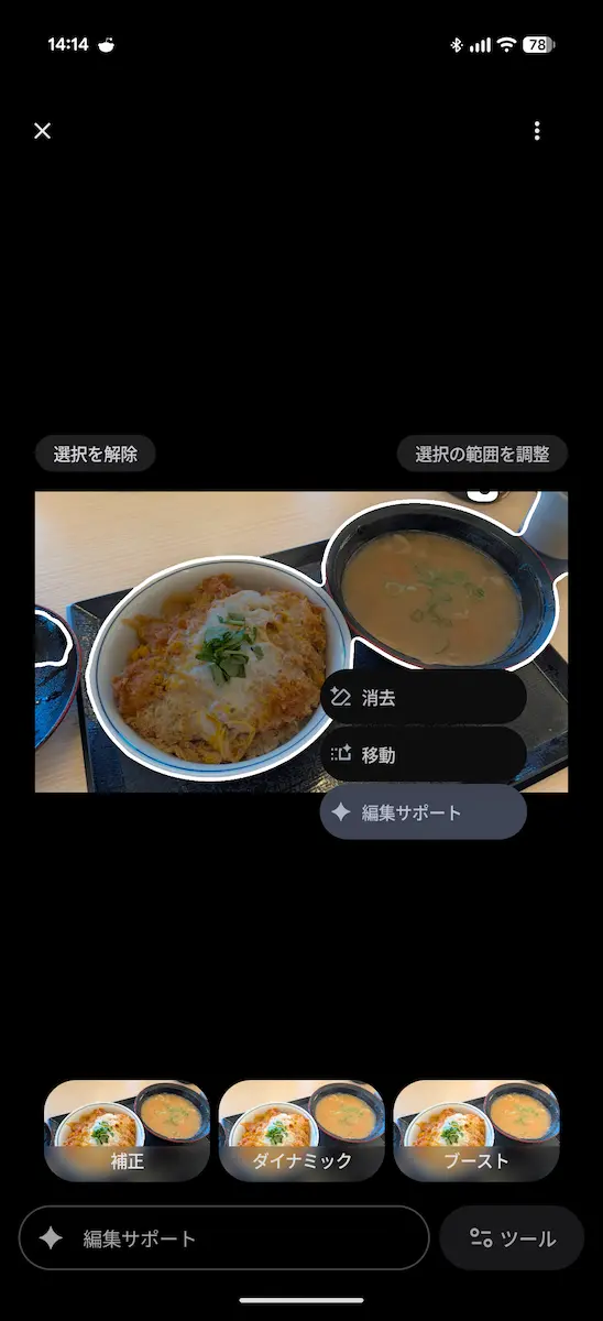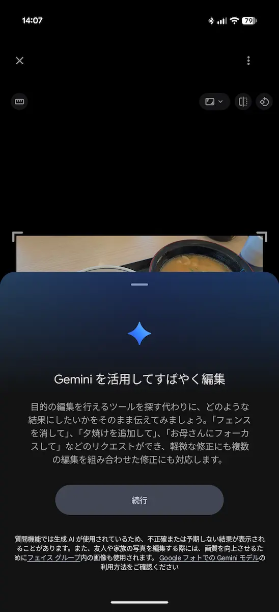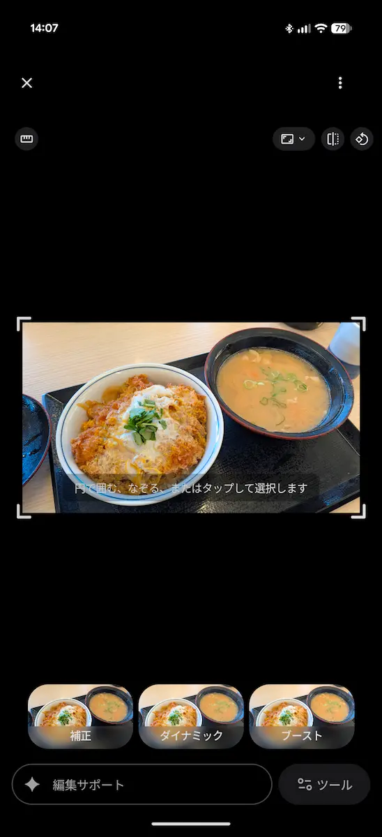 この機能は、Google フォトで写真の編集画面にある画面下にある「編集サポート」と表示されたチャットエリア、もしくは画像をタップして範囲選択画面からアクセスすることができます。