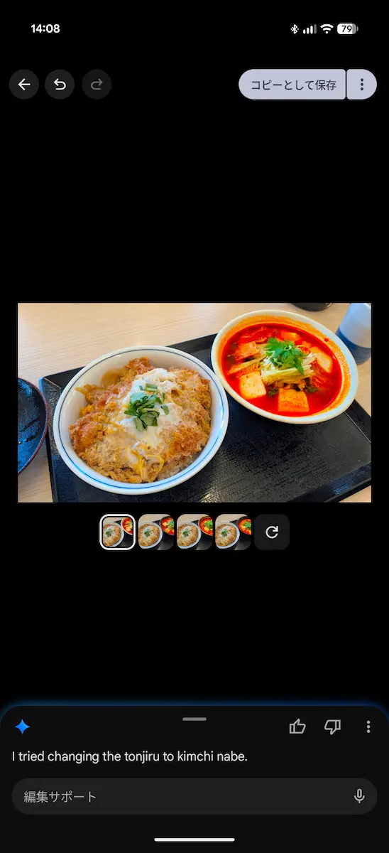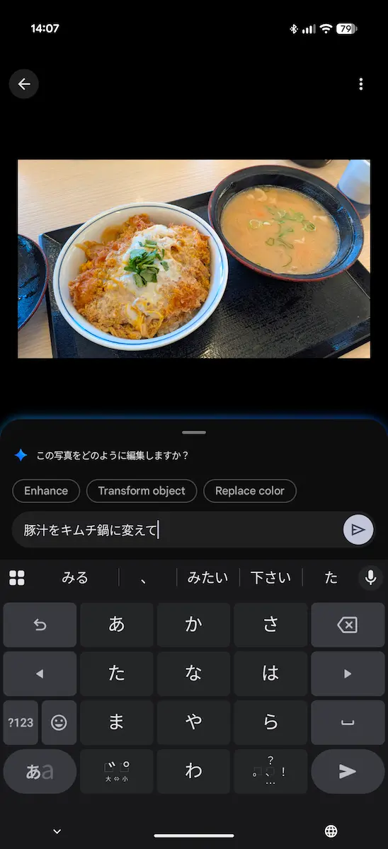 以下は実際に Pixel 10 Pro Fold で試してみた様子ですが、プロンプトで操作することができるため、細かく調整するのが手間であったり、画像編集の知識がなくてもある程度の編集が可能でした。