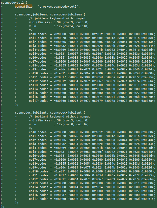 また、キーボードの設定ファイルに「Acer Chromebook Plus 514 / Plus 516」を示す「Jubilant」と「Jubileum」の 2 つのコードネームが記載されていることが確認でき、1 つのコードネームで 2 つのサイズ展開がある(テンキーなし/あり)可能性もあります。
