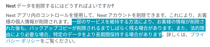 Google のプライバシーに関する FAQ や利用規約では、削除されたデータであっても、バックアップシステムに残存する場合や、法的な要請(法的保持義務)がある場合には、通常より長くデータが保持される可能性がある旨が記載されています。