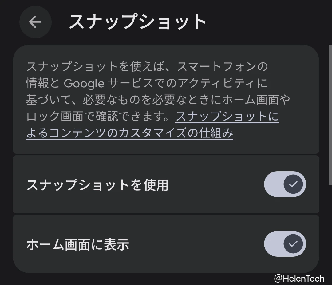 ホーム画面を長押しして、[ホームの設定] > [スナップショット] から [ホーム画面に表示] のトグルをオフにすることで、ホーム画面からスナップショットを削除することができます。