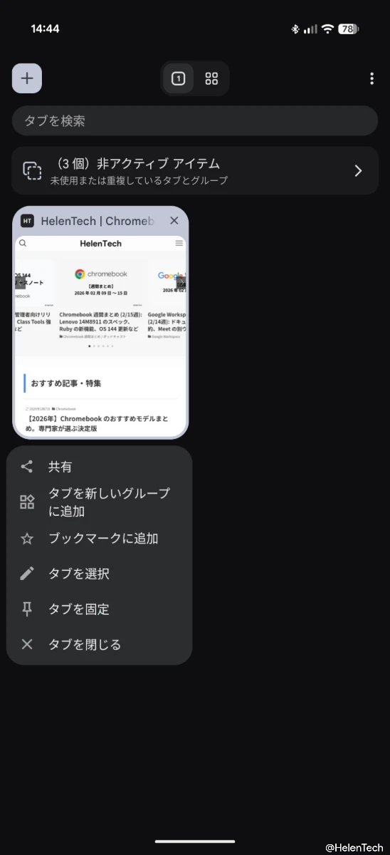 Android 版 Chrome でも、PC 版と同様に「タブの固定」が使えるようになりました。この機能は Android 版 Chrome のバージョン 144 以降で広く展開されています。