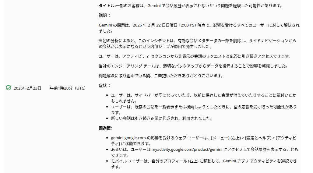 Google Workspace ステータスダッシュボードを通じて、この問題が正式に解決されたことが報告されました。現在はすべてのユーザーで履歴が正常に表示されるようになっています。