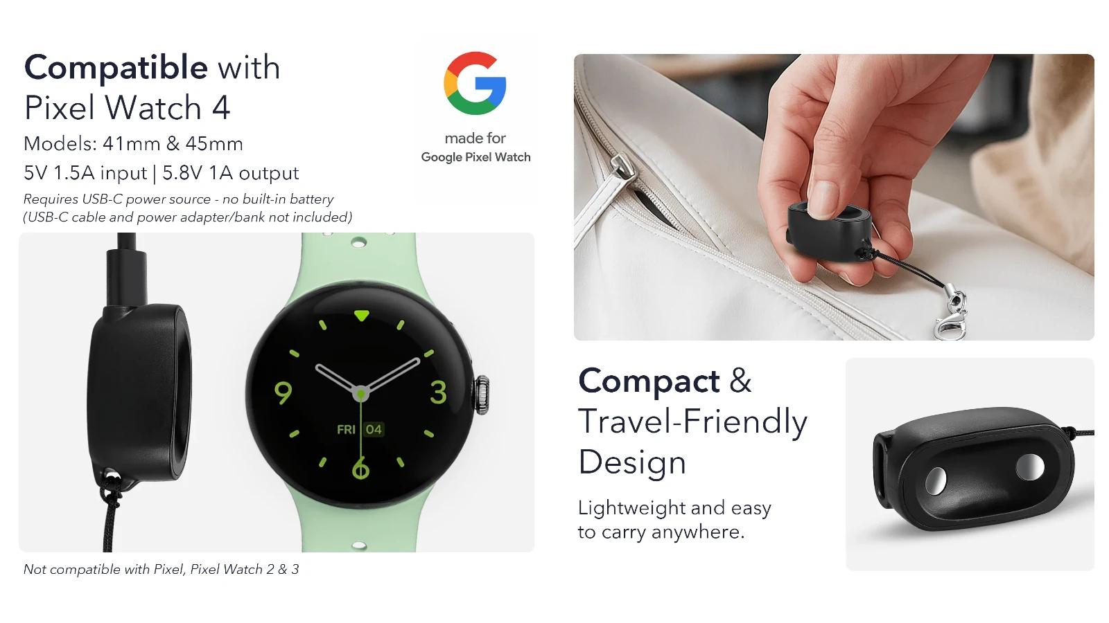 こうした中、Made for Google パートナーである Wasserstein から、Pixel Watch 4 に対応した小型の USB-C 充電器が海外で発売されました。