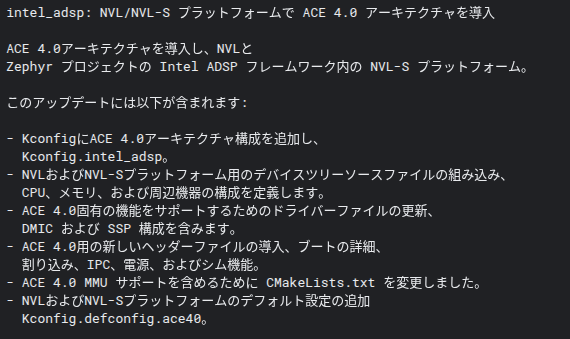 これには、Zephyr プロジェクトにおける Intel ADSP(オーディオ DSP)フレームワークに、次世代アーキテクチャである「ACE 4.0」を導入し、「NVL(Nova Lake)」および「NVL-S」プラットフォームをサポートする内容が含まれています。