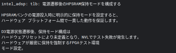 また、追加されたコミットのなかには、「NVL の FPGA (開発用擬似チップ) 環境において、スリープ状態 (D3) から復帰する際にメモリ (HPSRAM) の設定がリセットされてしまう問題」を修正したという内容も見つかりました。