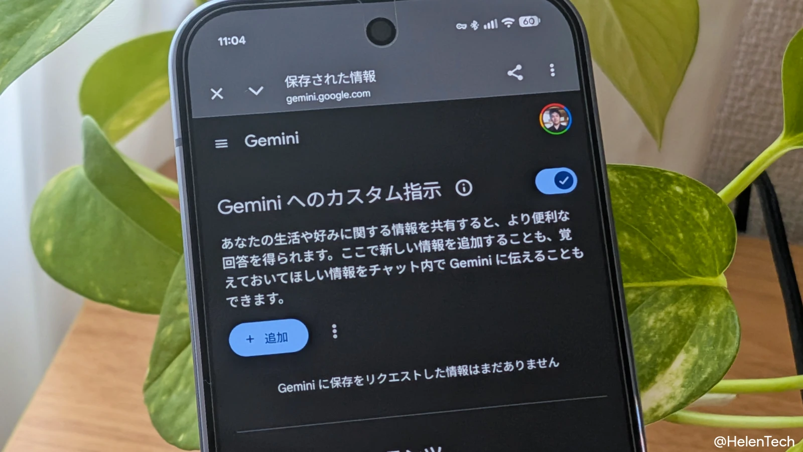 このページ内にある「Gemini との過去のチャット」のトグルスイッチで切り替えができ、その下にはプロンプトの前提条件を設定できる「Gemini へのカスタム指示」も表示されるようになります。