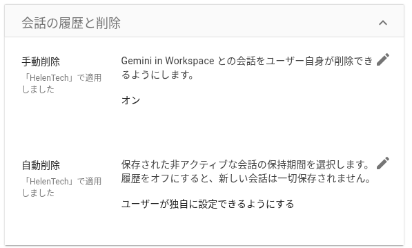 - 自動削除機能: 非アクティブなチャットを 3 ヶ月、18 ヶ月、3 年経過後に自動削除するか(デフォルトは無期限保存)