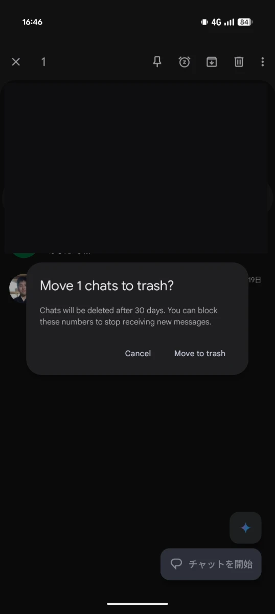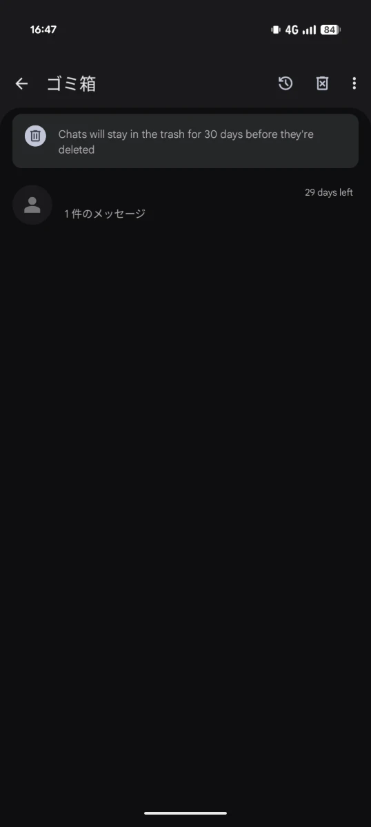 今回の変更により、アプリ内の「削除」アクションが「ゴミ箱」に置き換わっています。一覧からメッセージを長押ししてゴミ箱ボタンをタップすると、30 日後に完全に削除されるといったポップアップが表示されます。