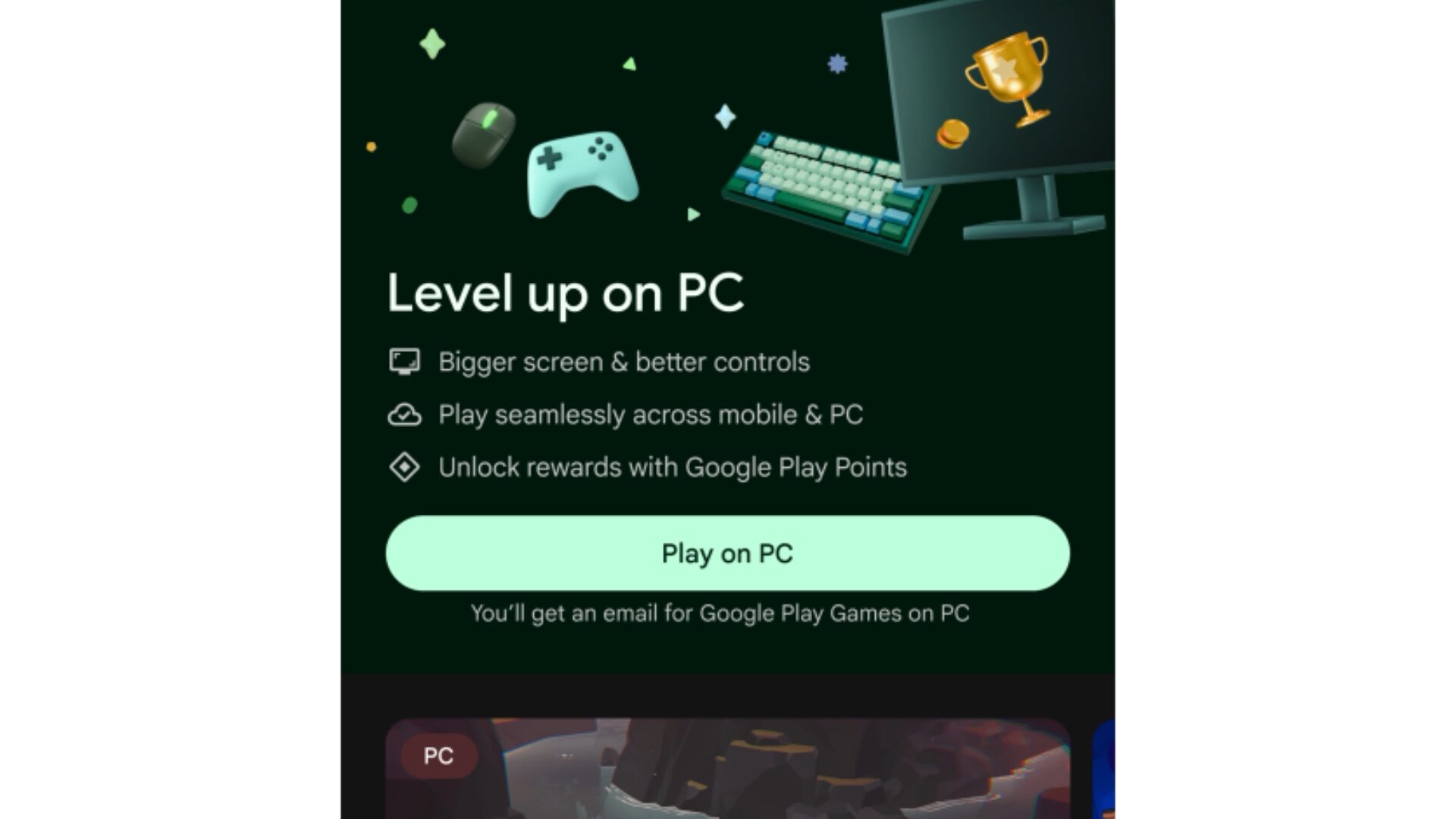 Android 版の Google Play ストアアプリ内に、新たに「PC」専用のタブが追加されました。これにより、モバイルデバイスから直接 PC 向けゲームを探すことができるようになります。