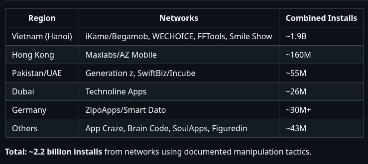 - iKame / Begamob (ベトナム): 4つ以上の Play ストアアカウントで130以上のアプリを展開し、約15億回のインストールを記録。