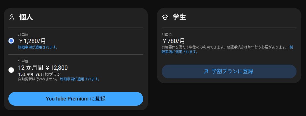 執筆時点での日本における YouTube Premium 個人プランは月額 1,280 円となっています。