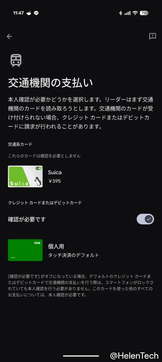 これをオンにすることで、交通機関の支払いでデフォルトのクレジットカードまたはデビットカードを使うときにも本人確認が必要になります。