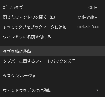 「側面タブ」を利用するには、Chrome のウィンドウ上部を右クリックして [タブを横に移動] を選択します。同様に、側面タブ表示のときには [タブを一番上に移動] をタップすることで、水平に戻せます。または Chrome の [設定] > [デザイン] > [タブバーの位置] からでも変更可能です。
