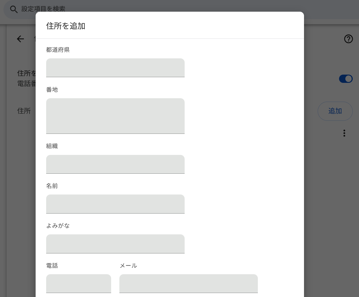 この場合は、「連絡先情報」または「住所」をクリック (chrome://settings/contactInfo) して、[追加] を選ぶとふりがなを登録することができます。