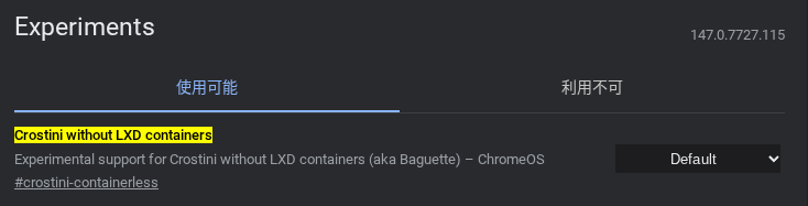なお、この機能は chrome://flags にある #crostini-containerless フラグで制御でき、必要に応じて無効化 (Disabled) することも可能です。