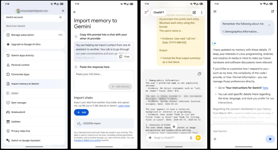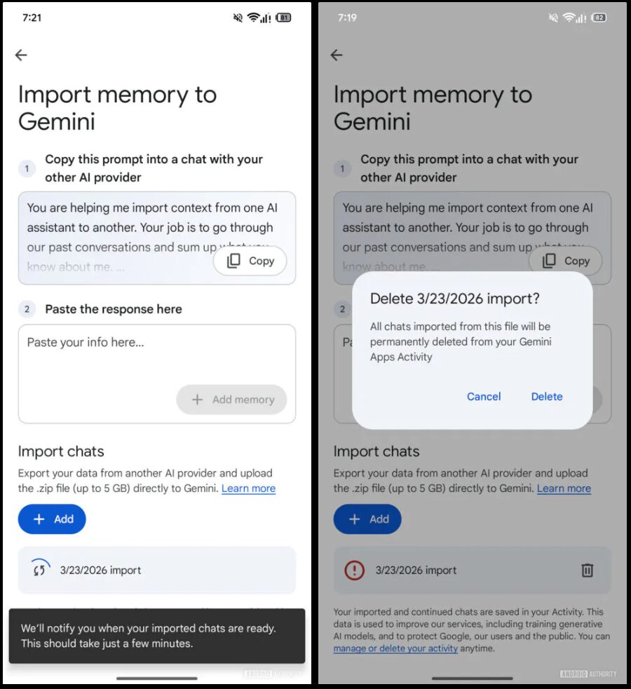 Android Authority が最新の Google アプリのコードから、ChatGPT などの他の AI サービスから情報をインポートする機能の仕組みを発見し、実際に機能の一部を有効化できたことを報告しています。