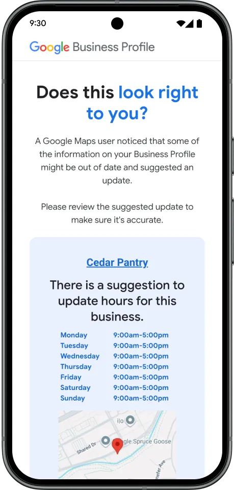 ビジネスオーナーが店舗の営業時間や臨時休業などの情報を管理しやすくするため、重要な編集提案を事前に確認できる通知機能が追加されます。