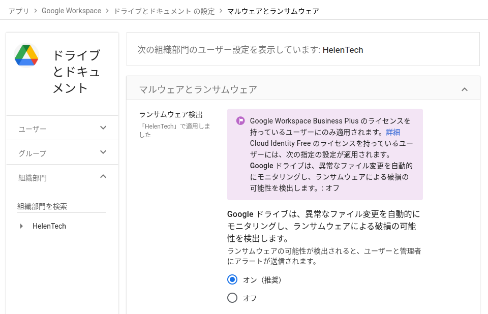 一方、「ランサムウェア検出機能」については以下の Google Workspace プランを利用しているユーザーに限定されます。