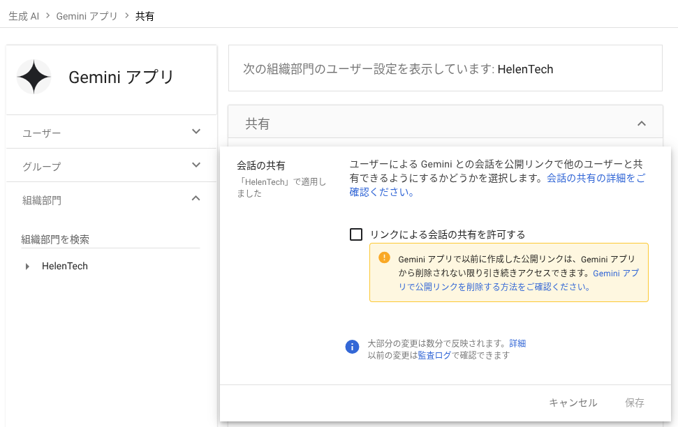 この設定は管理コンソールの [生成 AI] > [Gemini アプリ] > [共有] から変更できます。