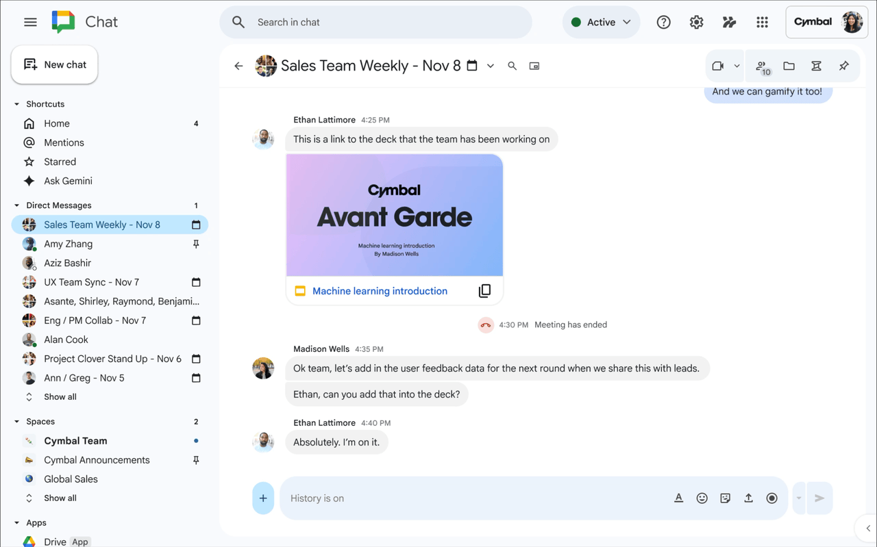 これまで Google Meet などで会議中に発生したチャットは、ダイレクトメッセージのセクションにまとめられていましたが、今回のアップデートにより、専用のセクションに集約して管理できるようになります。