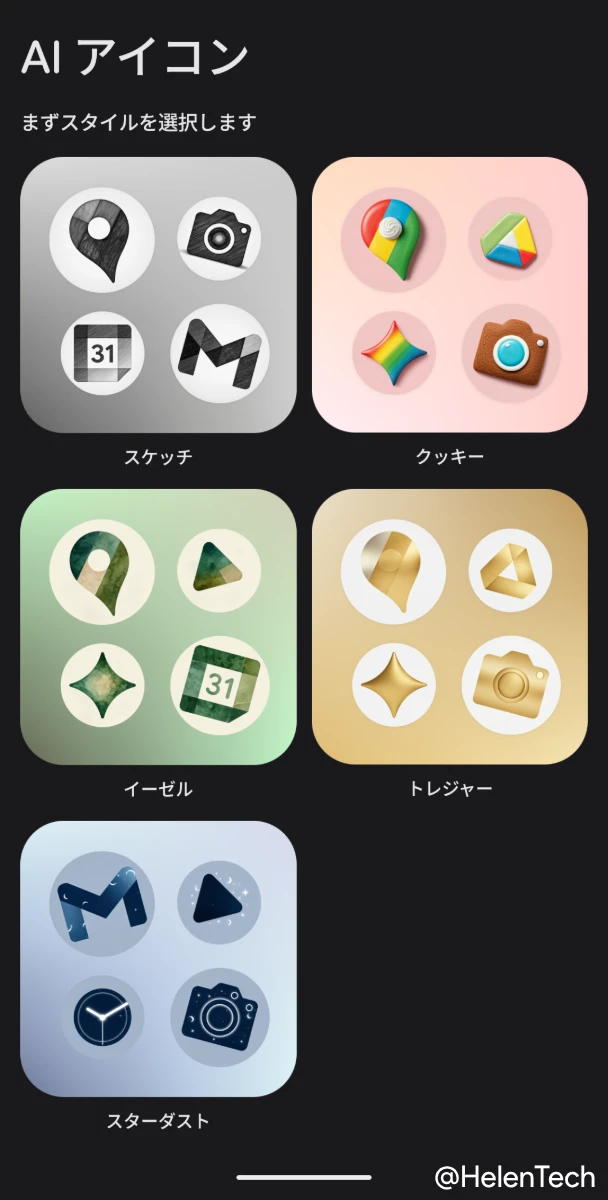 そうすると、前述の 5 つのスタイルを選択する画面に移動し、作成したいスタイルをタップして確認画面を進むと、AI アイコンが適用されます。