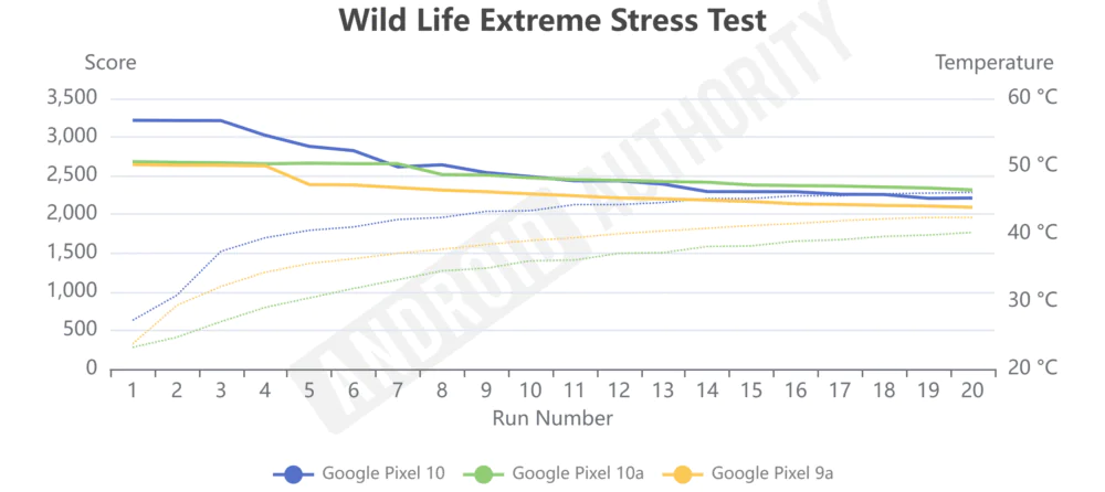 基本性能に大きな変化はありませんが、ストレステストにおいては Pixel 10a が Pixel 9a を上回る結果を示しています。Android Authority が実施した 3DMark の Wild Life Extreme ストレステストでは、テスト開始直後のパフォーマンスは両機種で同等ですが、時間の経過とともに Pixel 10a のほうが低い本体温度を維持しています。