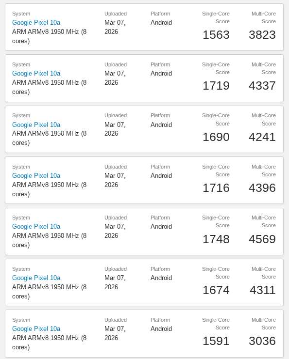 Geekbench 6 による CPU ベンチマークテストの結果では、Pixel 10a と Pixel 9a のスコアは誤差の範囲内です。同じチップとクロック数を備えているため、想定通りの結果と言えます。