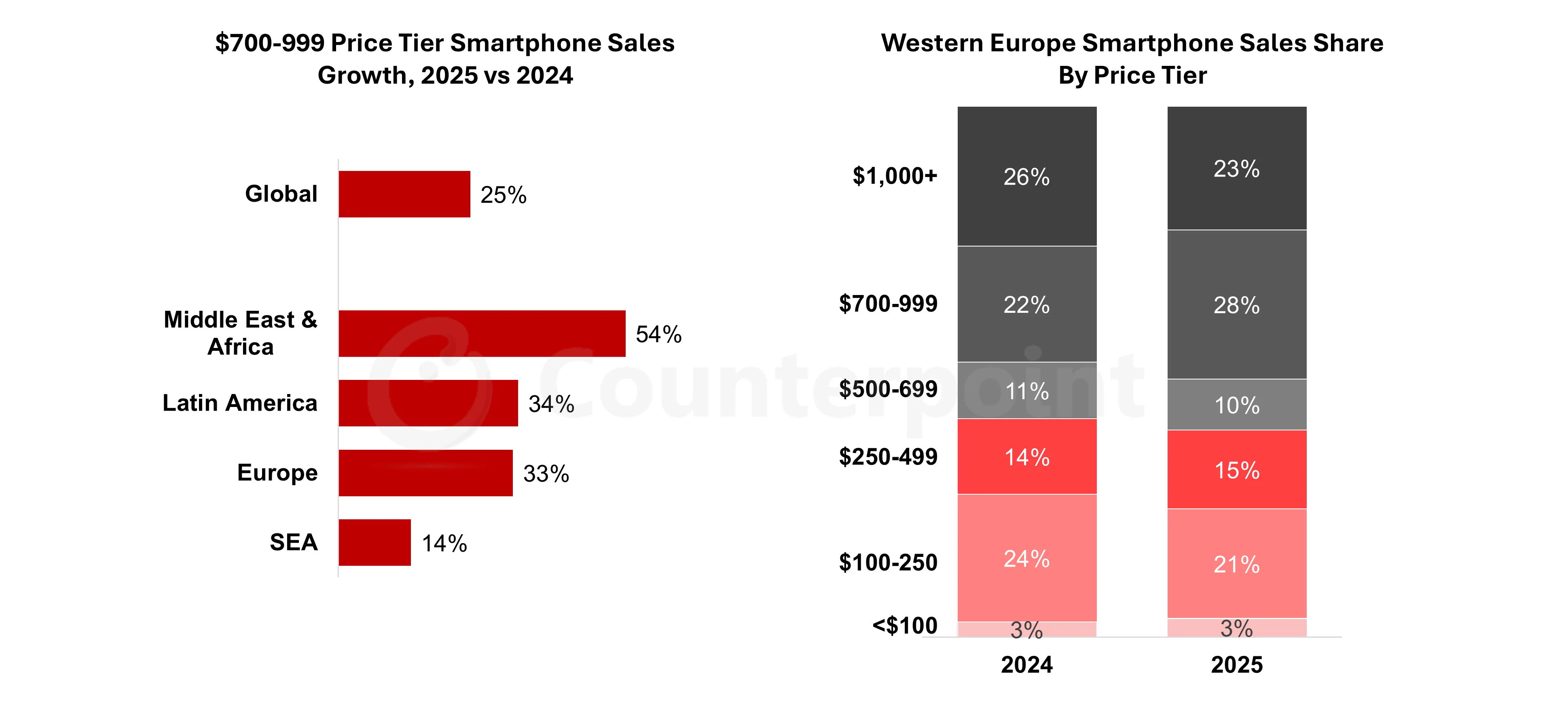 Counterpoint のデータによれば、この価格帯のスマートフォンは世界中で最も成長しており、中東やアフリカ、ラテンアメリカ、ヨーロッパなどの地域では最大 54% の販売増を記録しました。