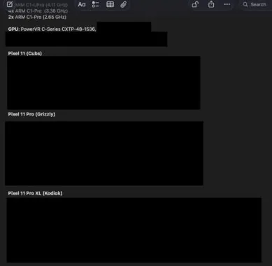 今回のリークは、Telegram チャンネル Mystic Leaks によるもので、画像の一部は伏せられているものの、Pixel 11 シリーズを示すコードネームが確認できます。