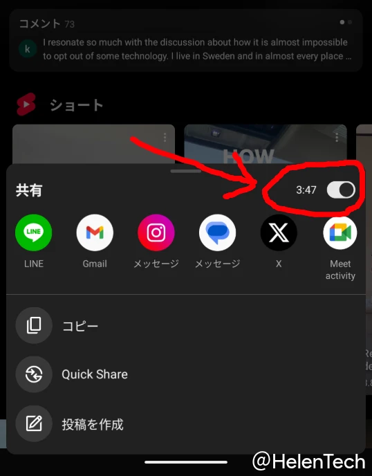 最新の Android 版 YouTube アプリで確認したところ、動画の再生画面下部にある共有ボタンをタップすると、共有メニュー内に現在位置を示す時間のトグルスイッチが表示されます。