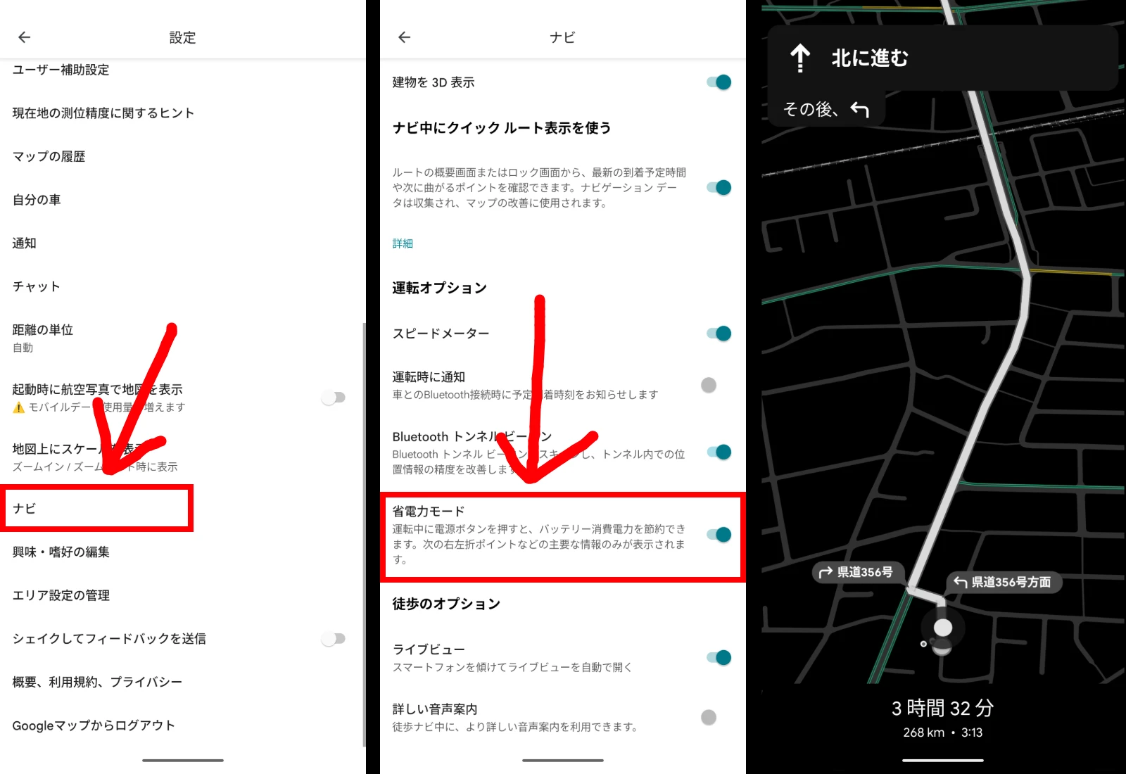 設定後、ナビ中に電源ボタンを押せば「省電力モード」を切り替えることができます。